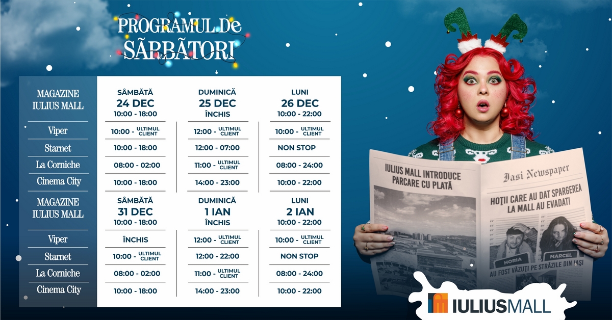 Pe 25 decembrie, angajaţii magazinelor vor sărbători Crăciunul, însă Cinema City pornește videoproiectoarele de la ora 14.00, Viper și Starnet deschid pentru distracţie de la ora 12.00, iar cafeneaua La Corniche te aşteaptă de la ora 11.00. Pe 26 decembrie programul Iulius Mall revine la normal.