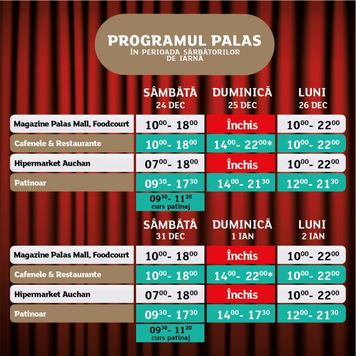 Pe 31 decembrie ne pregătim de petrecere, Palas fiind deschis doar până la ora 18.00. Hypermarket-ul Auchan este deschis de la 07.00 până la 18.00, iar patinoarul îi aşteaptă pe amatorii de distracţie în intervalul 09.30 – 17.30. Începe noul an la o cafea cu cei dragi sau la o sesiune de dans pe gheaţă, cafenelele și patinoarul din Palas fiind deschise de la ora 14.00! De pe 2 ianuarie 2023 programul revine la normal.