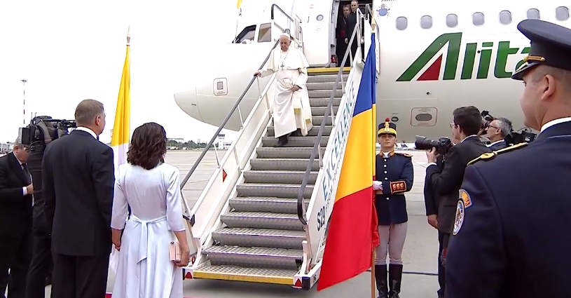 Știrea inițială: Suveranul Pontif a fost așteptat de către președintele Klaus Iohannis și prima doamnă.
