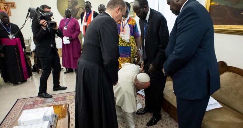 Papa Francisc a făcut un gest fără precedent la Vatican, pentru mijlocirea păcii în Sudanul de Sud, măcinat de un război civil care a făcut 400.000 victime. A sărutat picioarele liderilor, în genunchi și a implorat pacea.