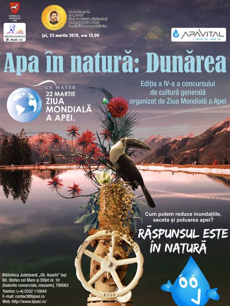16 licee, unul din Pașcani și 15 din municipiul Iași, și-au anunțat participarea la ediția din acest an a concursului organizat de Ziua Mondială a Apei. Competiția se va desfășura joi, 22 martie 2018, de la ora 12.00, la Filiala „Ion Creangă” (Casa de Cultură a Sindicatelor, Bd. Socola, nr. 134) și este organizată de Biblioteca Județeană „Gh. Asachi” și ApaVital SA Iași. Este al patrulea an consecutiv al concursului, tema ediției este „Apa în natură: Dunărea” și a fost inspirată de sloganul ales de ONU pentru campania din acest an, „Natura pentru apă” („Nature for Water”).