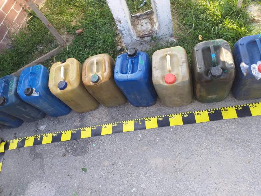Atunci oamenii legii au descoperit peste 10 bidoane de 20 de litri, în care se afla gazolină, un combustibil foarte volatil și inflamabil, despre care bărbatul n-a ştiut să spună de unde e, și nici soţia sa, care se afla cu el în maşină.