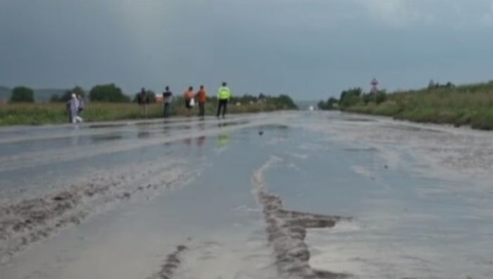 Dezastru pe Drumul European 581, între Vaslui şi Bârlad. O rupere de nori a paralizat traficul în zonă, după ce puhoaiele care s-au scurs de pe versanţi au adus pe asfalt nisip şi pietriş de la o moară din zonă.