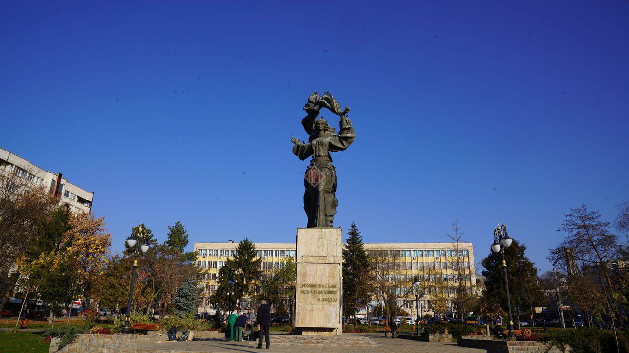 În anii ’90 acesta a fost înlăturat și amplasat cel actual, după dorința inițială a sculptorilor: „Independența e suma vieții noastre istorice”.