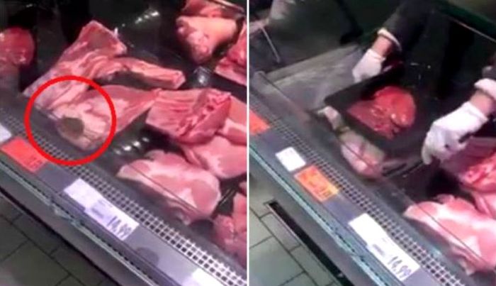 Un filmuleț postat pe Facebook de un client arată cum șoarecele se plimbă pe carne, iar apoi o angajată a hypermarketului Kaufland încearcă să îl prindă, cu mâna.