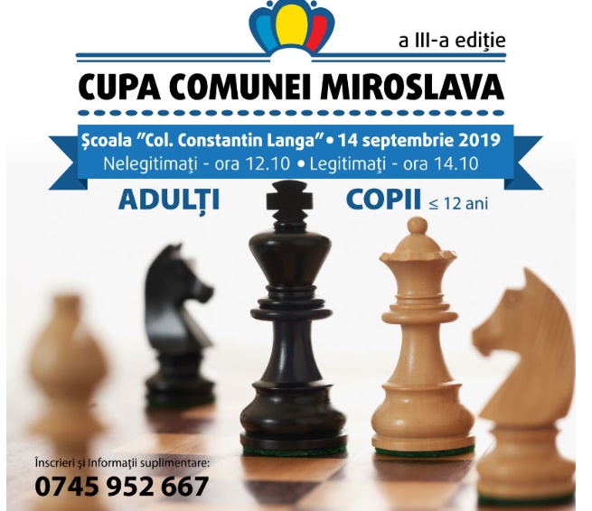 Sâmbătă, 14 septembrie 2019, începând cu orele 12.10, la Școala “Col. Constantin Langa” din Miroslava se va desfășura a III-a ediție a concursului “Cupa Comunei Miroslava” la șah.