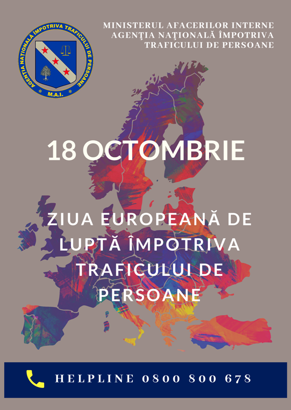 În perioada 14 – 20 octombrie 2019, Agenţia Naţională Împotriva Traficului de Persoane (A.N.I.T.P.) organizează o serie de evenimente dedicate marcării Zilei Europene de Luptă Împotriva Traficului de Persoane – 18 octombrie, incluse în cadrul campaniei de informare şi prevenire “Săptămâna prevenirii traficului de persoane”.