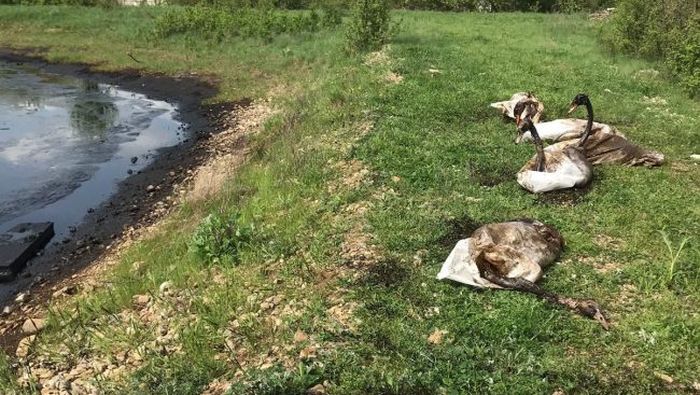 Șase lebede, în stare critică după ce au fost scoase dintr-o baltă cu reziduuri petroliere din Bihor