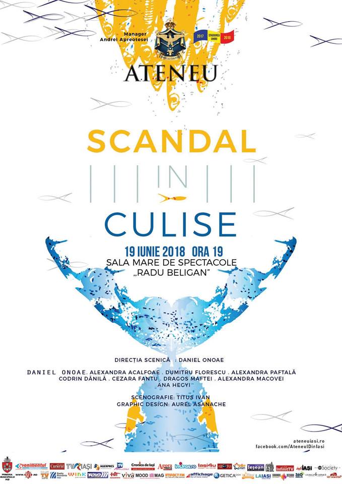 Sunteți invitati la o nouă reprezentație a spectacolului „Scandal în culise” ce va avea loc în Sala Mare de Spectacole „Radu Beligan” a Ateneului din Iași.