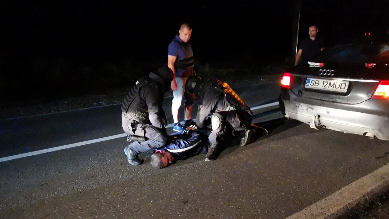 Bărbatul a fost oprit în trafic și încătușat de polițiști.