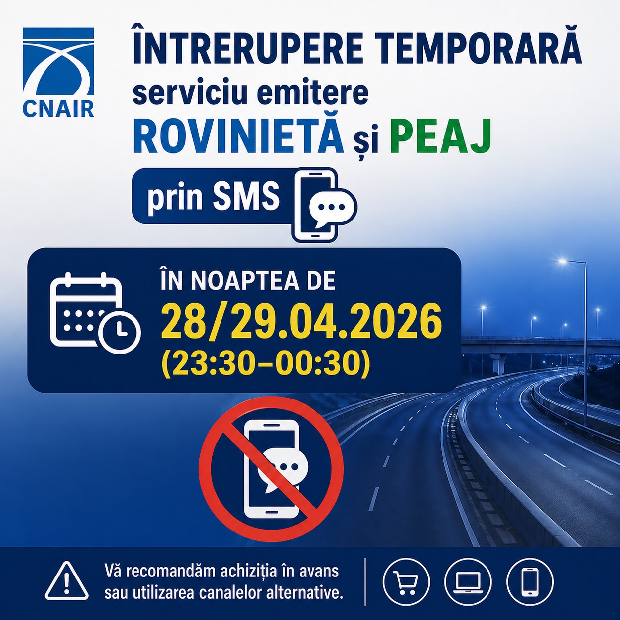 CNAIR informează utilizatorii rețelei de drumuri naționale, drumuri expres și autostrăzi că, în perioada 28.04.2026, ora 23:30 – 29.04.2026, ora 00:30, sunt programate lucrări de mentenanță, motiv pentru care serviciile de emitere roviniete si peaje prin SMS vor fi temporar întrerupte.