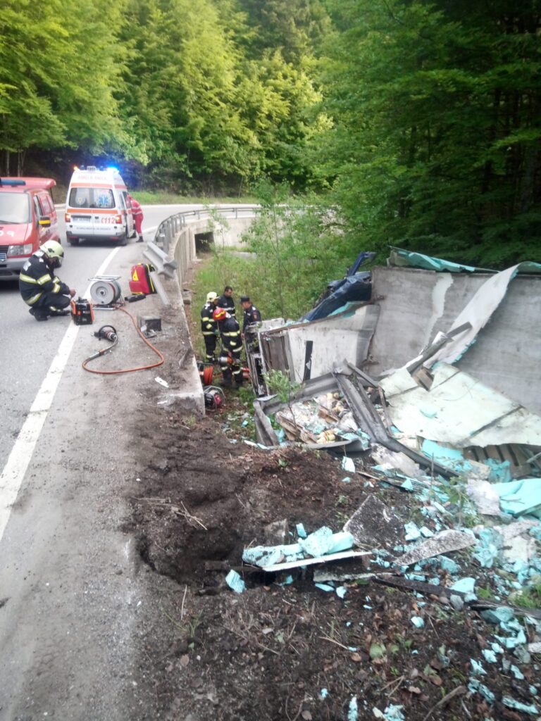 Un autocamion a părăsit partea carosabilă și s-a răsturnat, conducătorul auto, un bărbat de 58 de ani, fiind încarcerat.