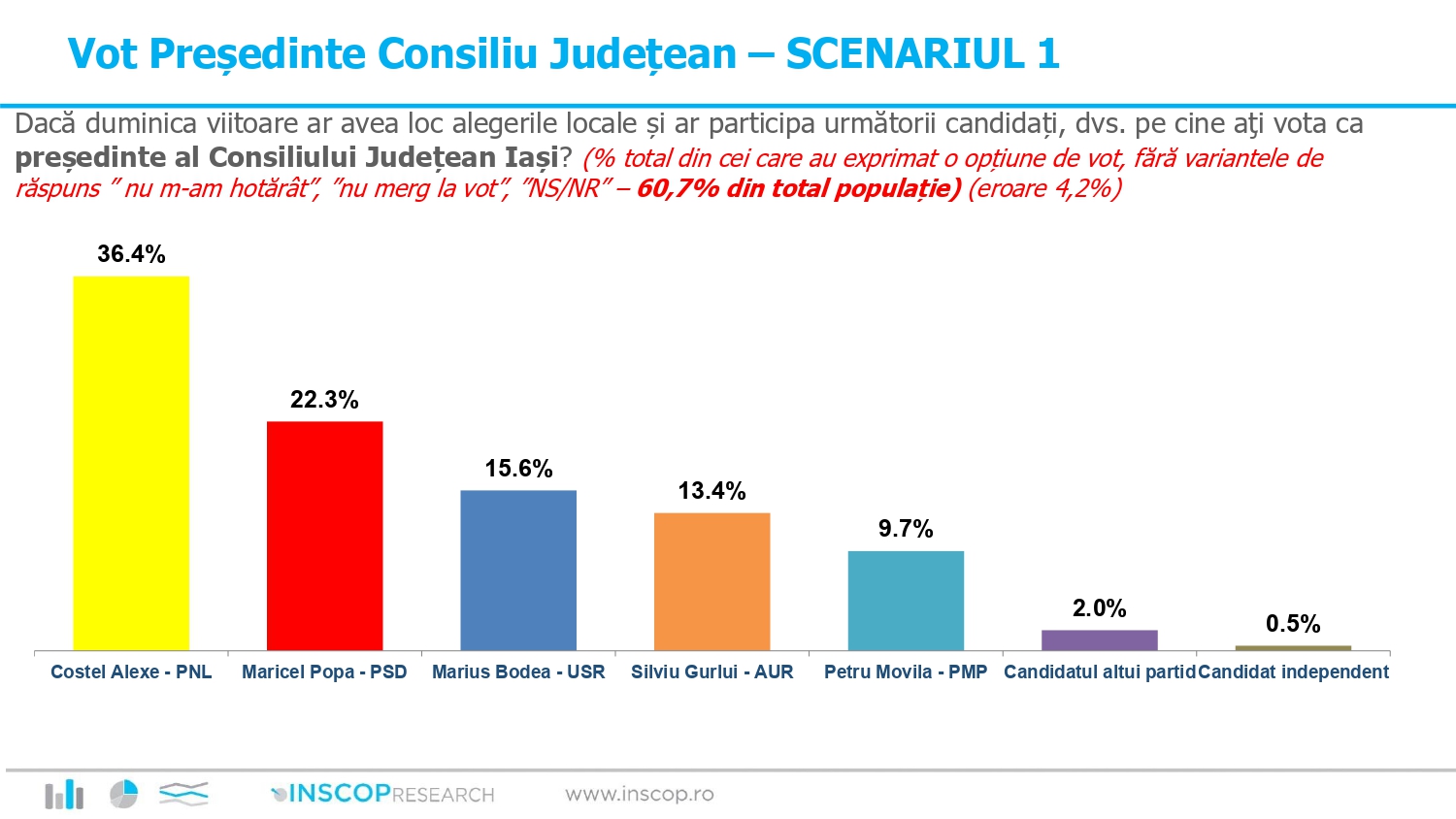 Astfel, dacă duminica viitoare ar avea loc alegeri locale, 38,2% ar vota la Consiliul Local Iași candidații Partidului Național Liberal, 24,4% ar vota PSD, 15,0% USR, în timp ce AUR ar întruni 12,2%, iar PMP 5,7% dintre opțiuni.