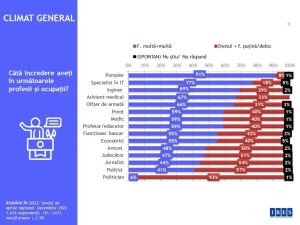 Sondajul mai relevă că profesia sau ocupaţia care beneficiază de cea mai puţină încredere în rândul românilor este cea de politician, doar 6% dintre cei întrebaţi afirmând că au foarte mare încredere, urmată de cea de poliţist cu 41% încredere şi de jurnalist – 44%. La polul opus, de cea mai mare încredere se bucură profesiile de: pompier – 91%, specialist IT – 77% şi inginer – 69%.