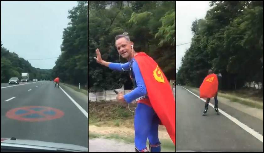Costumat în Superman, cu căştile în urechi şi rolele în picioare, omul era destul de grăbit, astfel că poliţiştii au pus sirena în funcţiune şi i-au spus să se oprească explicându-i că trebuie să iasă de pe partea carosabilă.