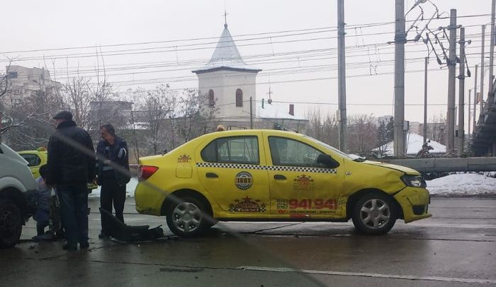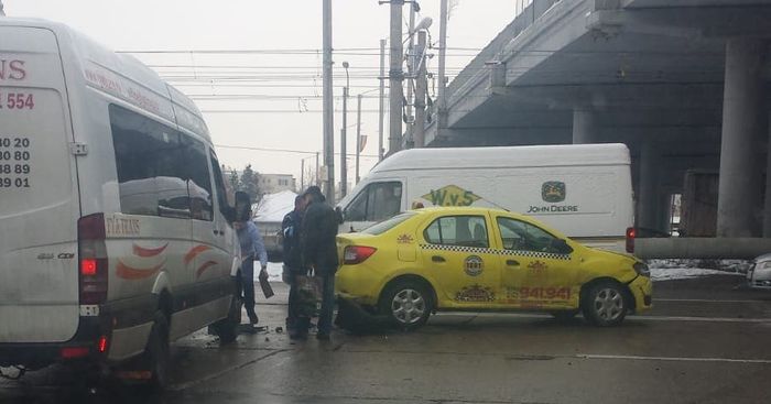 Un microbuz de pasageri nu a acordat prioritate și a lovit în plin un autoturism echipat taxi.