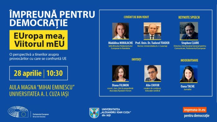 Universitatea „Alexandru Ioan Cuza” din Iași și Biroul Parlamentului European în România, în colaborare cu Centrul Europe Direct Iași organizează vineri, 28 aprilie 2023, ora 10.30, în Aula Magna „Mihai Eminescu”, dezbaterea „ÎMPREUNĂ PENTRU DEMOCRAȚIE: EUropa mea, viitorul mEU – O perspectivă a tinerilor asupra provocărilor cu care se confruntă UE”.