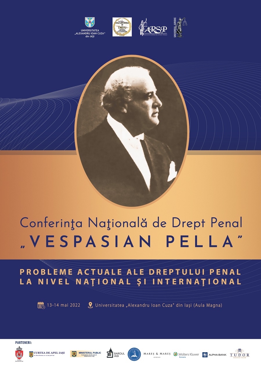 Universitatea „Alexandru Ioan Cuza” din Iași (UAIC) – Facultatea de Drept, Asociația Română de Științe Penale și Grupul editorial Universul Juridic organizează, în perioada 13-14 mai 2022, prima ediție a Conferinței Naționale de Drept Penal „Vespasian Pella”, cu tema „Probleme actuale ale dreptului penal la nivel național și internațional”.