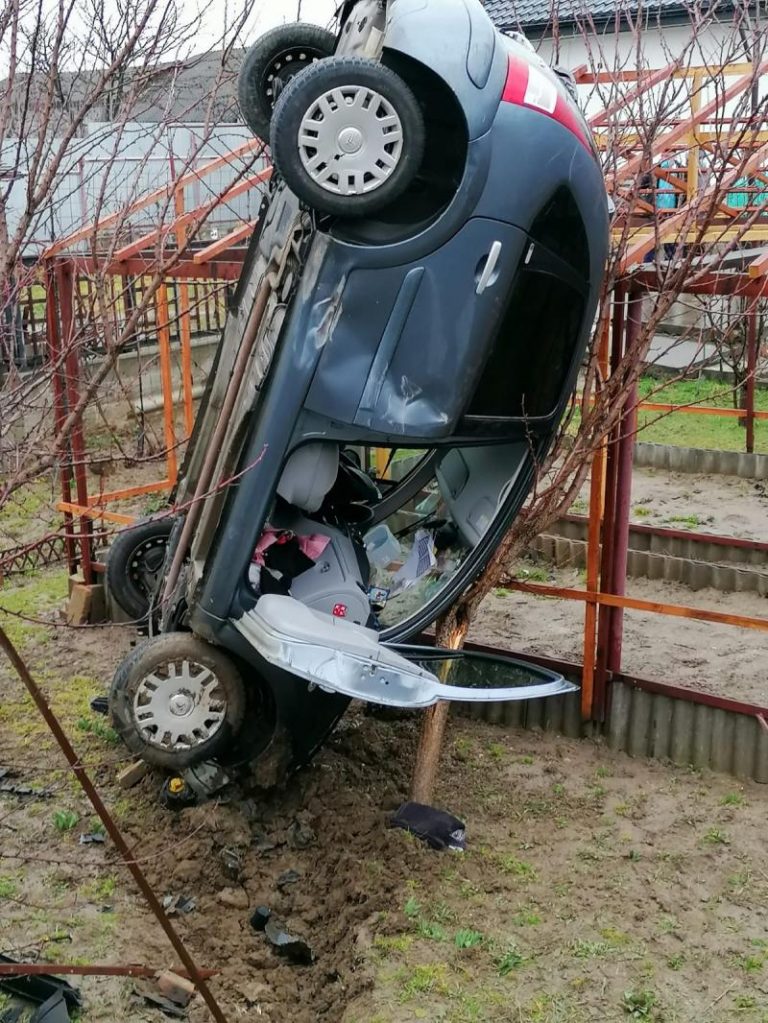 Accident spectaculos, în această dimineață. în localitatea Hemeiuș, județul Bacău. Camerele de supraveghere au surprins momentul în care o mașină iese de pe carosabil, se răstornă, apoi rămâne suspendată în plan vertical, în grădina unui localnic.