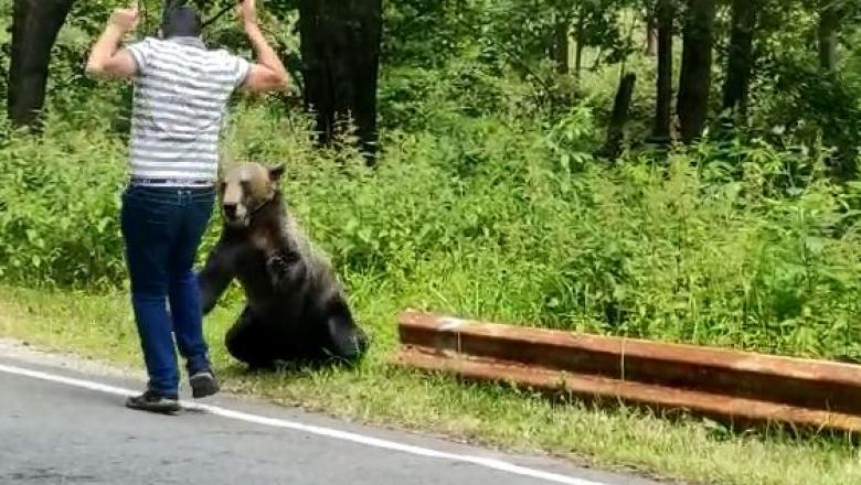 Un tânăr a fost la un pas să fie sfâşiat de un urs care cerşea mâncare la marginea drumului, în apropiere de Cetatea Poienari din judeţul Argeş.