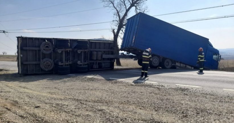 Accident rutier duminică după-amiază, pe DE 85 în Mirosloveşti, judeţul Iaşi. Un TIR care transporta ajutoare pentru refugiaţii ucraineni, plecaţi din calea războiului, s-a răsturnat.