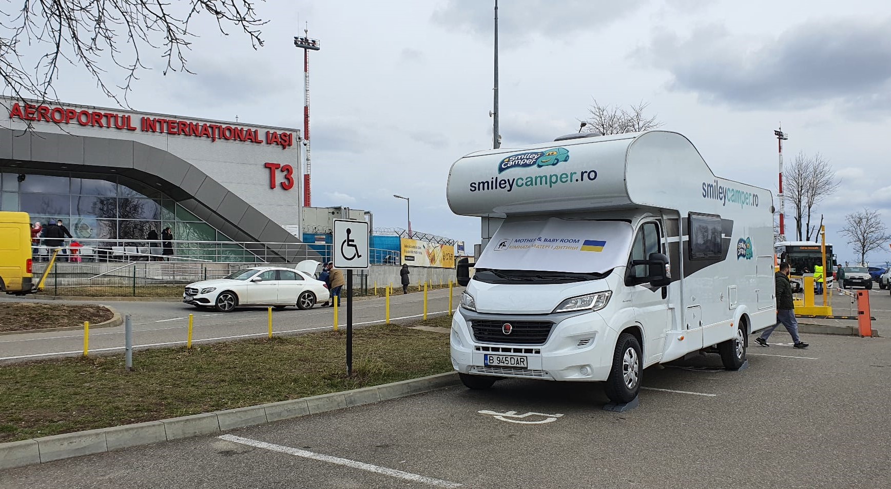 Aeroportul Iași și Smiley Camper au amenajat în parcarea din fața terminalului T3 o zonă „Mama și Copilul” pentru a veni în sprijinul călătorilor ucraineni, având în vedere intervalul mare de timp pe care aceștia îl petrec în aeroport.